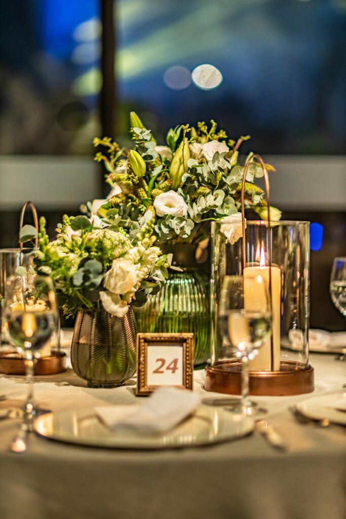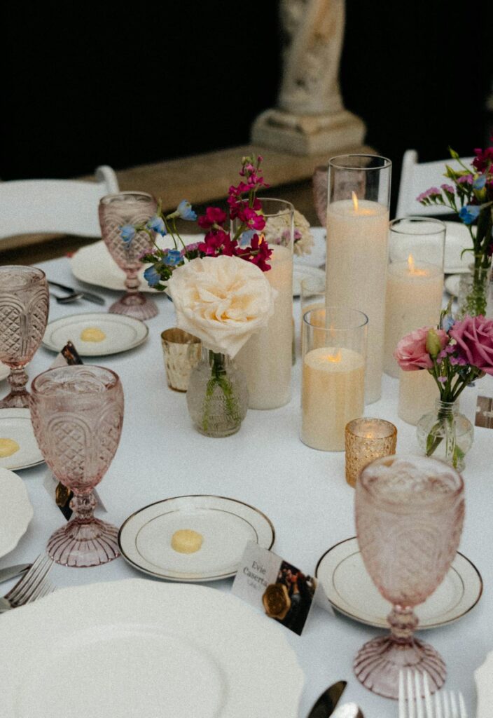 You can lay the garland loosely across the table and tuck in small flowers or candles to fill it out. Eucalyptus also holds up well throughout a long reception without wilting quickly, which makes it a practical choice on top of being a beautiful one.
