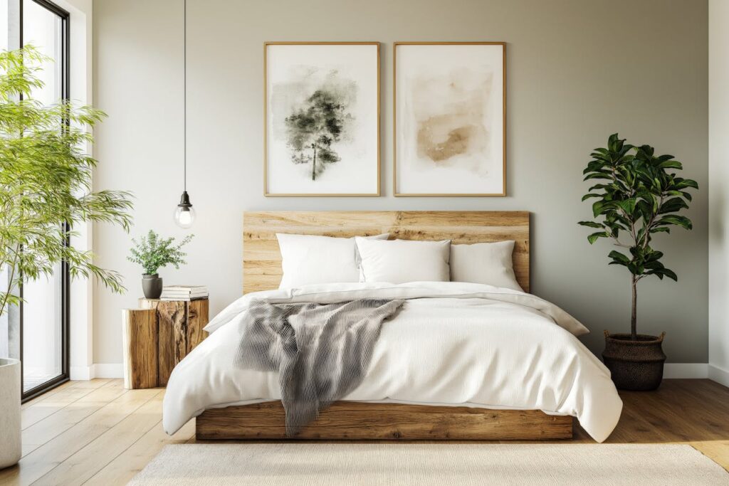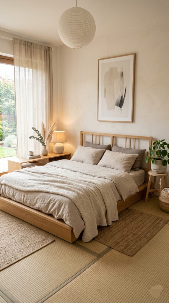 A low bed frame is one of the most important parts of a Japandi bedroom. It creates a grounded, calm feeling that is hard to get with a tall bed. Light oak or walnut are the best wood choices for this style.