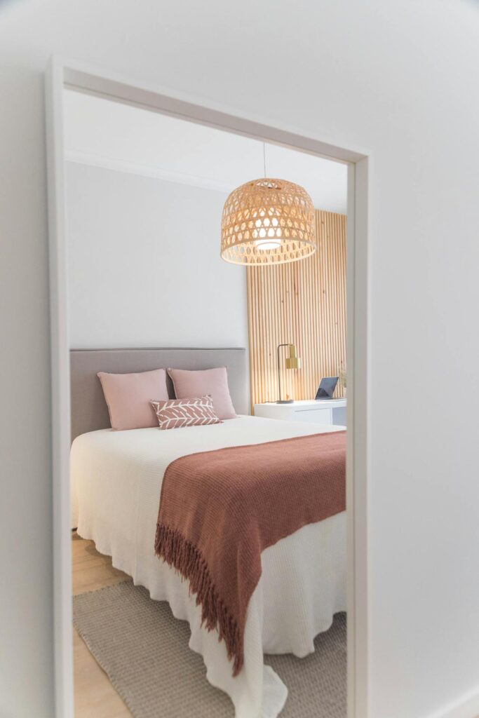 Avoid bright whites or bold patterns. Soft, muted tones are what give a Japandi bedroom its peaceful mood.