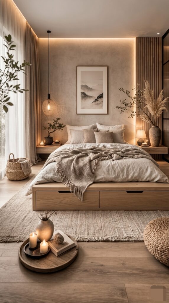 A platform bed with hidden storage is both practical and beautiful in a Japandi bedroom. The clean lines keep the room looking neat, and the built-in drawers remove the need for extra furniture. This is one of the best ways to stay minimal without losing function.
