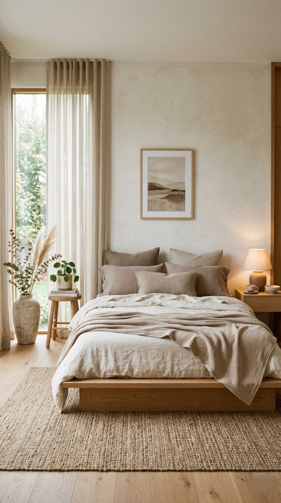 Sheer curtains let soft natural light flow into a Japandi bedroom during the day. They make the room feel airy and open without letting in too much harsh sunlight. Choose curtains in white, cream, or light linen tones to keep the look calm and cohesive.