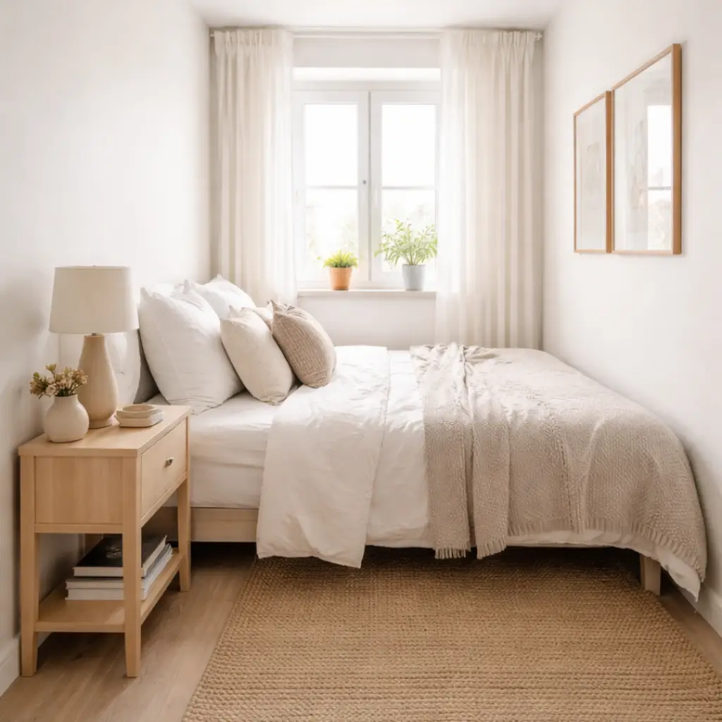 Start by making a firm decision to limit decorative objects. This doesn’t mean stripping your room of personality; it means being selective. Instead of fifteen small decorative items scattered across every surface, choose three or four that you genuinely love and give them room to breathe. A single piece of meaningful art, one beautiful plant, a candle you actually burn,  these things add character without adding visual noise. In a small bedroom, less really does feel like more.