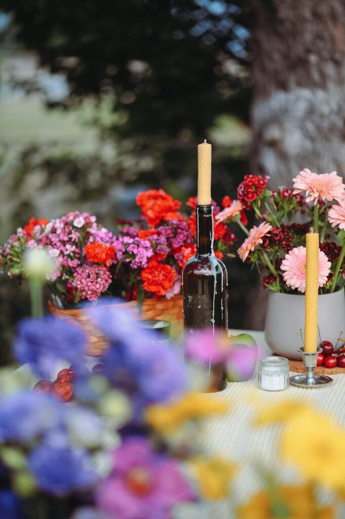 Empty wine bottles make elegant and free candle holders for your tables or ceremony space. Place a long taper candle in the neck of each bottle and let the wax drip naturally for a bohemian rustic effect.