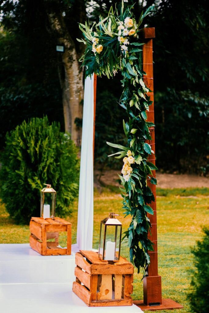 A simple wooden arch covered in greenery and a few flowers creates a stunning ceremony focal point. You can build the frame yourself using basic timber from a hardware store and style it with eucalyptus, ivy, or garden roses.
