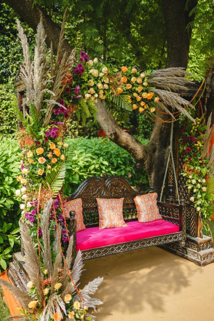 If your garden has a tree swing, style it with a few flower garlands and trailing greenery for a romantic look. The swing becomes a natural photo spot that guests will love.