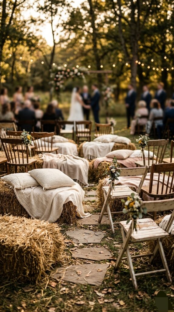 They work well as ceremony seating, lounge area benches, or casual spots around the reception. Hay bales are very affordable to rent or buy and they fit perfectly with a natural outdoor theme.