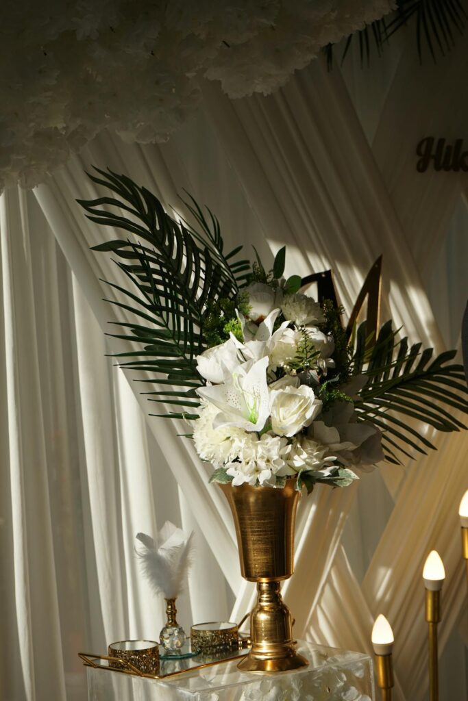 Hang lightweight fabric like chiffon or muslin behind your ceremony altar for a soft, flowing backdrop. Choose white, ivory, or a muted tone that complements your flowers and greenery.