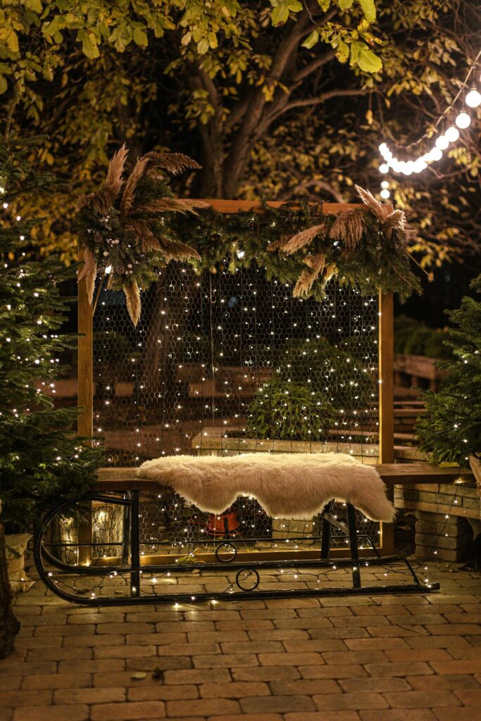 It takes very little time to set up and costs almost nothing if you already own a few sets of lights. The effect is soft, romantic, and pairs beautifully with other rustic lighting elements like lanterns and candles.