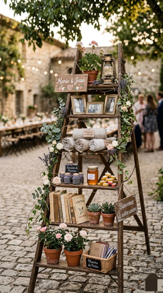 An old wooden ladder propped against a tree or wall makes a charming rustic display stand. Hang flower bunches from the rungs, lean framed photos against it, or place small candles on each step.