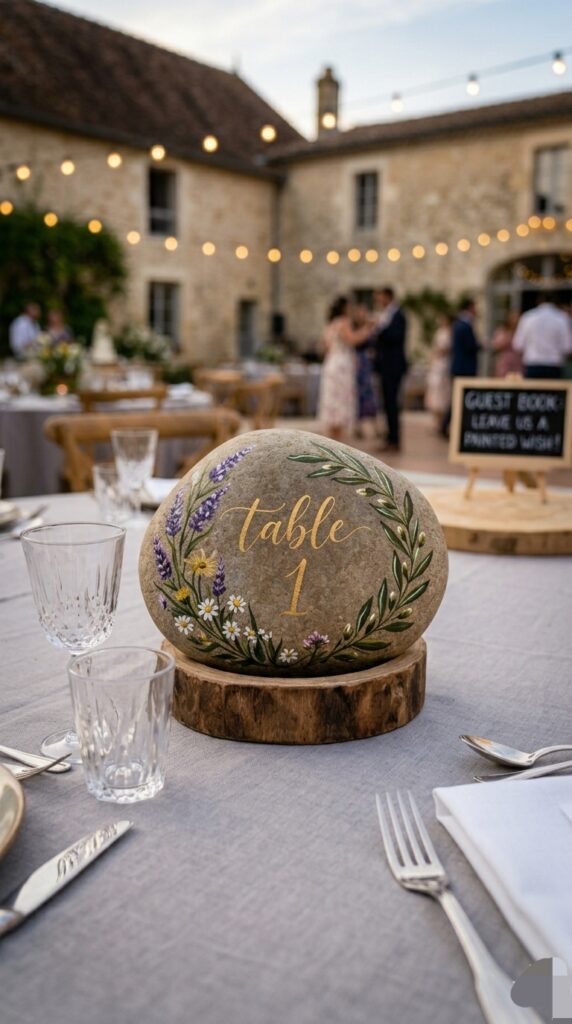 This idea takes very little time and costs almost nothing. The stones fit naturally into a rustic garden setting and double as a small keepsake guests can take home after the wedding.