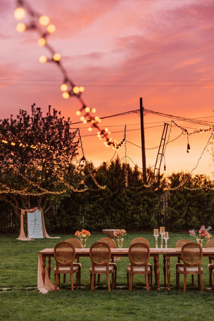 String lights hung above your dining tables instantly transform the atmosphere after sunset. The warm, soft glow creates a cozy, intimate feeling that works perfectly for an evening garden reception.
