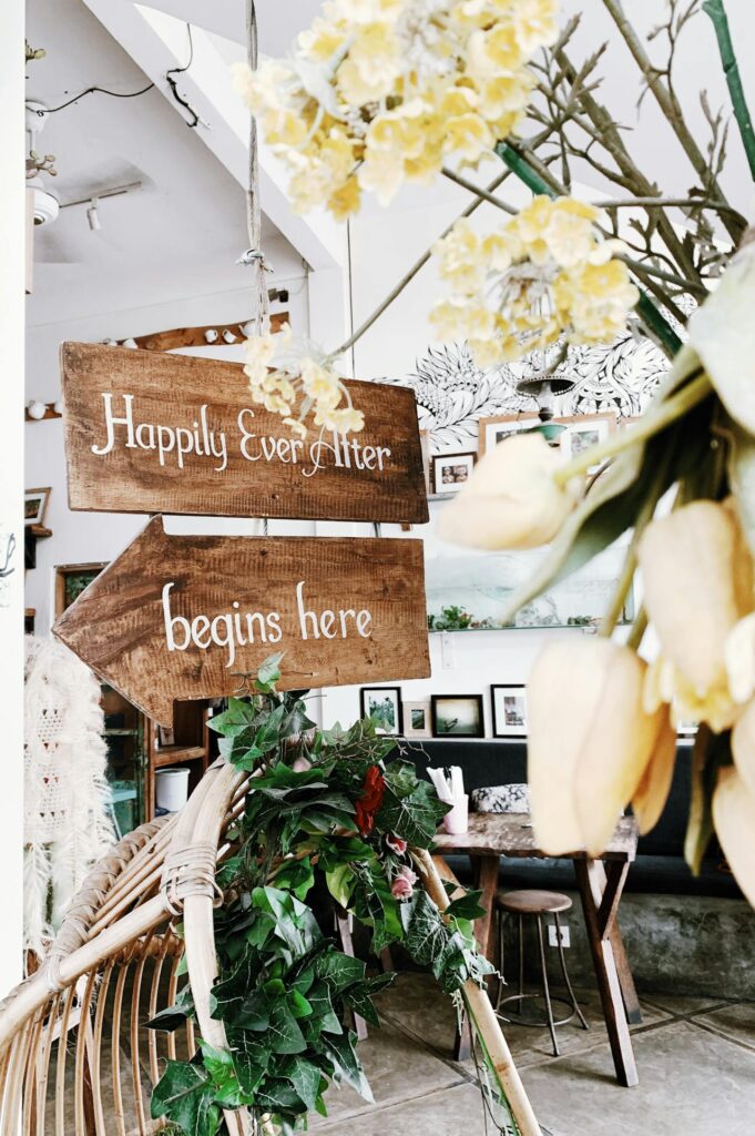 Build a wooden signpost with painted arrows pointing guests toward the ceremony, reception, bar, or seating area. This practical decor piece helps guests navigate your garden space while adding rustic charm at the same time.