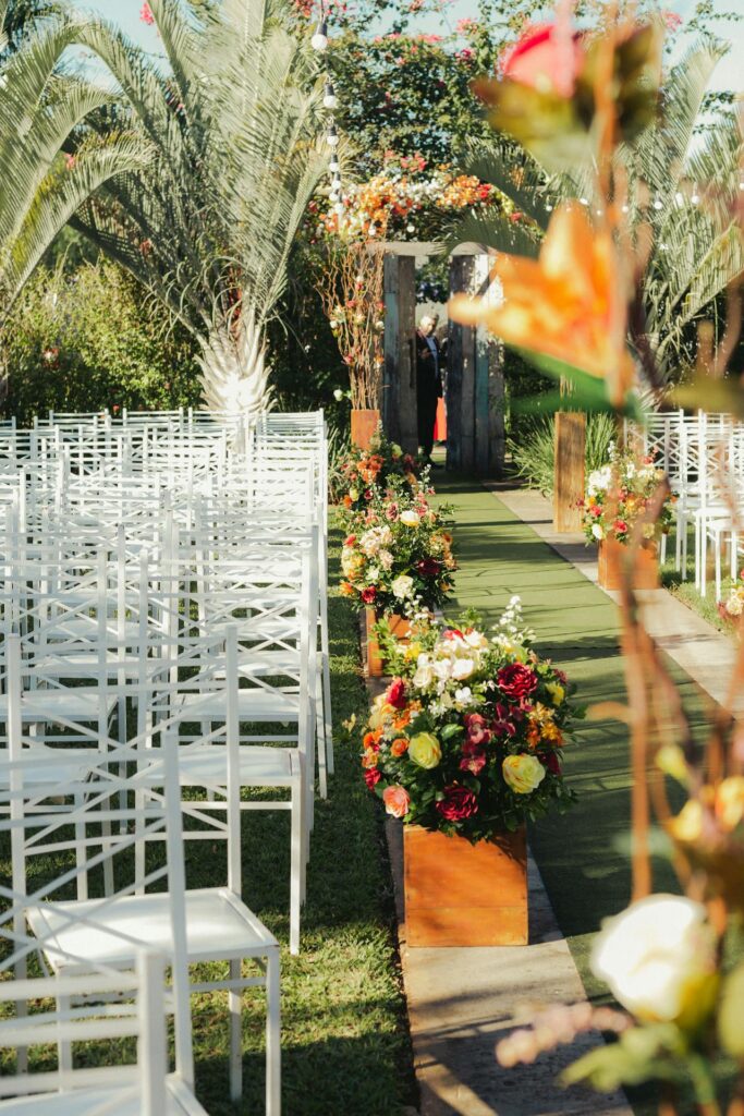 Scatter loose wildflowers along both sides of your ceremony aisle for a natural, garden-inspired look. You do not need structured floral arrangements. The casual, scattered style is part of the charm.